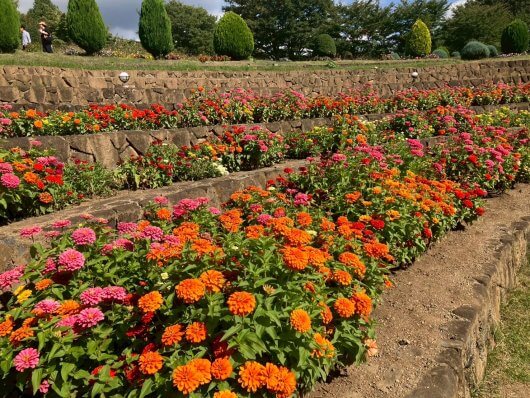 バラをはじめ、色とりどりの花々が秋風に揺れて、とても優雅な風景です。