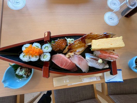 昼食会場での一枚。このツアーの目玉でもある ドでか江戸前寿司:通常サイズの約2.5倍のネタがずらりと並ぶ豪快な船盛です。 本マグロや地魚がネタに使われており、鮮度抜群でした。