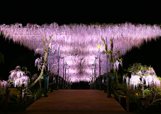 栃木県天然記念物に指定されている樹齢150年以上の600畳敷きの圧巻の紫の大藤や80mの白藤のトンネルなど