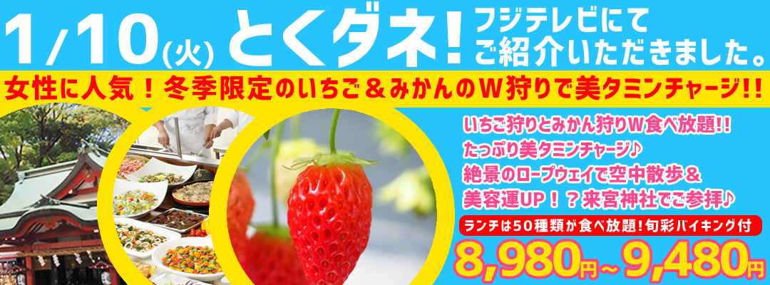 【静岡】冬季限定!!人気のいちご狩りとみかん狩りW食べ放題で美タミンチャージ♪富士を望む絶景のロープウェイで空中散歩&美容運UP!?来宮神社でご参拝♪