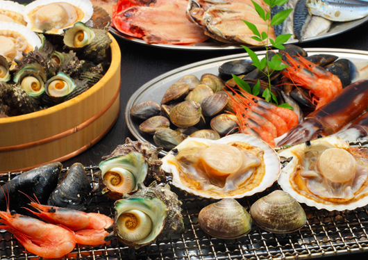 さざえや帆立などの貝類をはじめ、あじやさばなどの干物類、豚肉やウィンナー、 かぼちゃや玉ねぎなどお肉も野菜、さらにお寿司やデザートもご用意しています♪