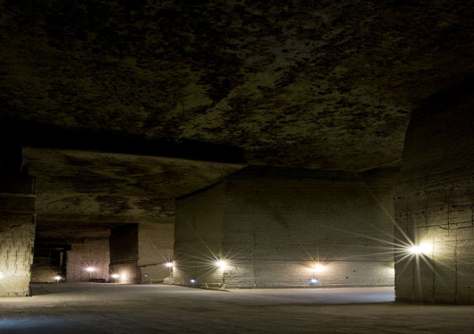圧巻なのは地下採掘場跡です。2万平方メートルにも及ぶ大空間で、深さは30m、最も深いところでは地下60mもあるという、まさに地下の巨大な建造物です。