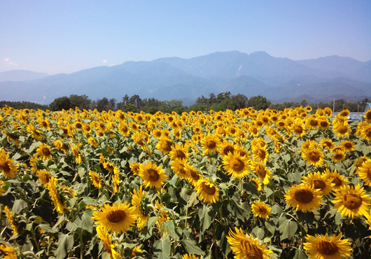 日照時間日本一のまぶしい太陽の下、南アルプス、八ヶ岳、富士山、茅ヶ岳など360度の大パノラマの中で咲き誇るひまわりとあふれる自然を満喫してください。