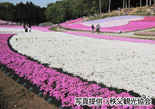 秩父の丘陵にある羊山公園の丘をうめつくす『芝桜』、自然のキャンパスに描かれた約40万株の白やピンクのふわふわお花の絨毯を眺めながら春をおもいっきり楽しみましょう!