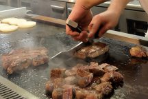 巨大な鉄板で焼き上げるステーキをはじめ、握り寿司、揚げたて天婦羅など、40種類以上の和洋中料理が食べ放題!