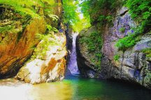 林道・山道を歩き、吊橋を渡りたどり着いたそこはまさに秘境。岩肌の間を高さ約21mから注ぐ滝はインスタ映えする絶景♪マイナスイオンをたっぷり浴びながらベストアングルを探しながらSNS映えする一枚を...