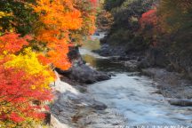 特に秋は格別の美しさ!モミジやカエデ、ナラなどの木々が赤や黄色に色づき、渓谷全体が鮮やかに染まります。