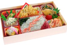 中央にはふっくらと炊き上げた白飯の上に、伊豆名物のしらすと桜えびをたっぷり!さらに、サクサクの天ぷらや、旬野菜のおひたし、風味豊かな煮物など、彩り豊かな副菜が揃い、伊豆の素材の良さを引き出したお弁当付きコースです!