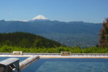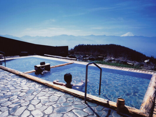 開放的な露天風呂の眼下には甲府盆地が広がり、天気がよければ富士山も望める絶景の温泉♪