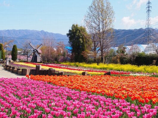 ハイジの村チューリップ祭りと大人気!桔梗信玄餅詰め放題!スイス&甲州郷土料理ランチビュッフェといちご狩り園内食べ放題♪旅行代金:大人